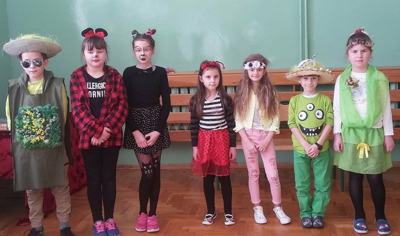 Uczniowie uczestniczyli w Wiosennym Turnieju Klas. Rozwiązywali zagadki dotyczące oznak wiosny i dbania o środowisko przyrodnicze, malowali oznaki wiosny, a także zbierali papierowe kwiatki przy pomocy plastikowej rurki i siły swojego wdechu. Na zakończenie na wybiegu nagrodzeni uczniowie zaprezentowali swoje przebrania.