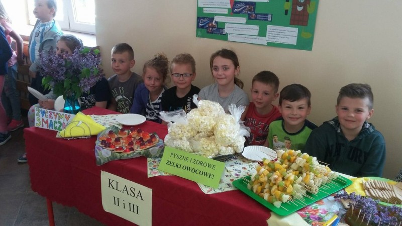Na korytarzu zaprezentowano plakaty promujące spożywanie zdrowej żywności, a poszczególne klasy – stoiska z taką żywnością, by teoria połączyła się z praktyką. Degustacja różnego rodzaju zdrowych smakołyków cieszyła się ogromnym powodzeniem, gdyż wręcz znikały w ustach andruciki, kolorowe kanapeczki-łódeczki, sałatki owocowe, a także czerwono-białe galaretki z bitą śmietaną oraz napoje przygotowane na bieżąco ze świeżych owoców. Wszyscy zachwycali się i bez mrugnięcia okiem wydawali kolejne 0,20 zł na kupno kiermaszowego rarytasu.