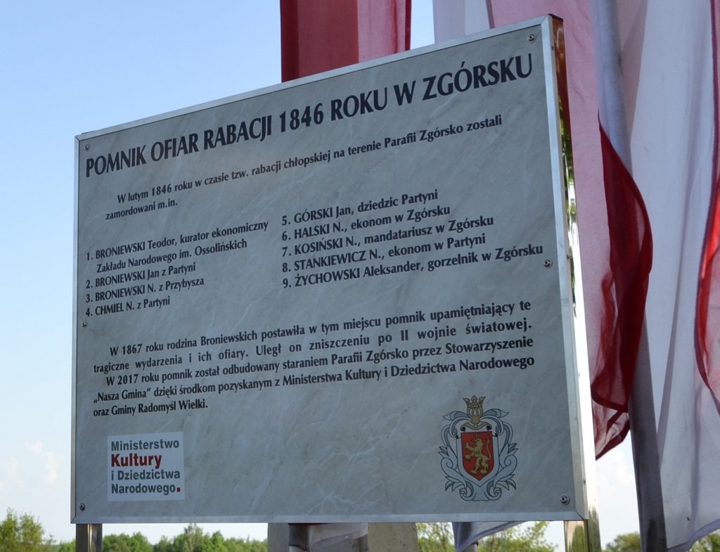 Przypomnijmy, że w lutym i marcu 1846 roku, w czasie tzw. rabacji chłopskiej, na terenie Galicji Zachodniej będącej pod panowaniem austriackim, doszło do tragicznych w skutkach rozruchów. Austriacy, chcąc doprowadzić do rozdźwięku w polskim społeczeństwie i tym samym zapobiec wybuchowi przygotowywanego powstania, wykorzystali niezadowolenie chłopów i - rozpuszczając plotkę o tym, że szlachta planuje przeciwko nim akcję zbrojną, pchnęli ich do mordów i rabowania szlacheckich dworów. W tym czasie splądrowano ok. 450 dworów i zginęło ok. 3 tysiące osób. Do tragicznych wydarzeń doszło także na terenie obecnej gminy Radomyśl Wielki, m.in. w Zgórsku.