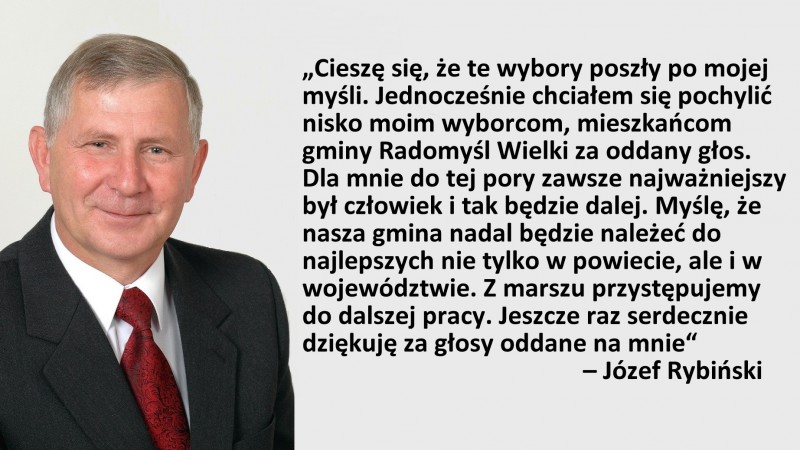 Tak na gorąco skomentował wyniki wyborów Józef Rybiński: - Oczywiście cieszę się, że te wybory poszły po mojej myśli. Jednocześnie chciałem się pochylić nisko moim wyborcom, mieszkańcom gminy Radomyśl Wielki za oddany głos. Dla mnie do tej pory zawsze najważniejszy był człowiek i tak dalej będzie. Myślę, że nasza gmina nadal będzie należeć do najlepszych nie tylko w powiecie, ale i w województwie. Z marszu przystępujemy do dalszej pracy. Jeszcze raz serdecznie dziękuję za głosy oddane na mnie.