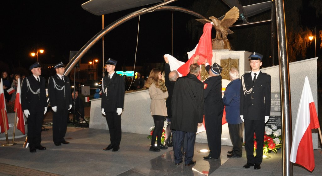 Jego odsłonięcia dokonali burmistrz Józef Rybiński, przewodniczący rady miejskiej Jan Miękoś, radny Andrzej Ziobroń, druh Wiktor Pachoł, przedstawicieli rodziców i uczniów – Agnieszka Jarosz i Izabela Jarosz. Z kolei ks. Jerzy Bulsa poświęcił pomnik i orła.