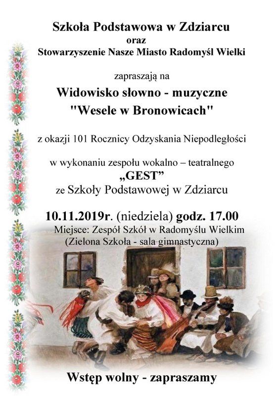 Już w najbliższą niedzielę (10 listopada) o godz. 17.00 w miejscowym Zespole Szkół wystawione zostanie widowisko słowno - muzyczne pt. „Wesele w Bronowicach”. To inicjatywa zespołu wokalno - teatralnego GEST ze Szkoły Podstawowej w Zdziarcu oraz Stowarzyszenia Nasze Miasto Radomyśl Wielki. Spektakl potrwa ok. 50 minut. - Jest to drugie widowisko wystawiane przez naszą szkołę w tym roku. Pierwsze pt. „Poezjo, wzbudź ducha narodu” było wystawiane wiosną br. w Radomyślu Wielkim i Mielcu. Program spotkał się ze sporym aplauzem publiczności i zdobył wielkie uznanie w środowisku. Liczymy, że teraz będzie podobnie, serdecznie zapraszamy – informuje Piotr Masłyk, dyrektor SP Zdziarzec.