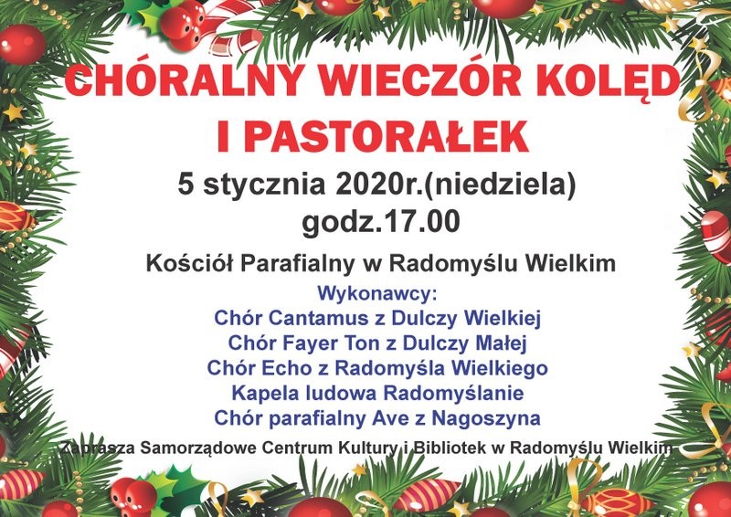 5 stycznia (niedziela) o godz. 17.00 w kościele parafialnym w Radomyślu Wielkim odbędzie się Chóralny Wieczór Kolęd i Pastorałek. Podczas koncertu będzie można posłuchać Chóru Cantamus z Dulczy Wielkiej, Chóru Fayer Ton z Dulczy Małej, Chóru Echo z Radomyśla Wielkiego, Chóru parafialnego Ave z Nagoszyna i Kapeli Ludowej Radomyślanie.