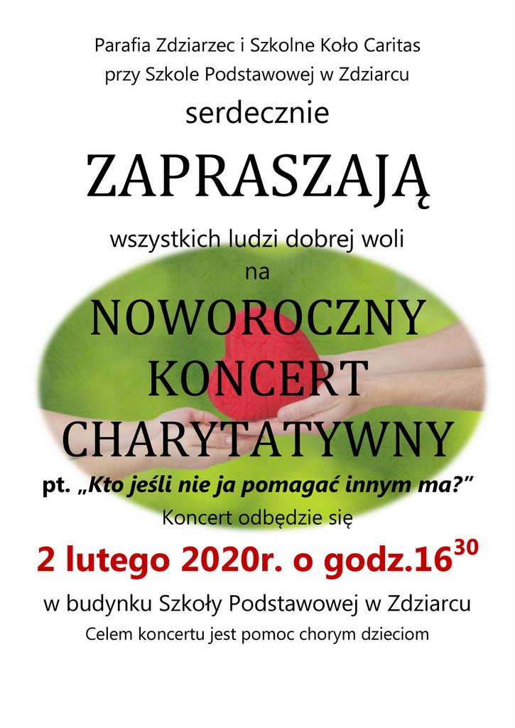 Zorganizowany zostanie pod hasłem „Kto jeśli nie ja pomagać innym ma?”. Koncert odbędzie się w najbliższą niedzielę 2 lutego o godz.16.30 w budynku Szkoły Podstawowej w Zdziarcu. Celem imprezy jest pomoc chorym dzieciom.
