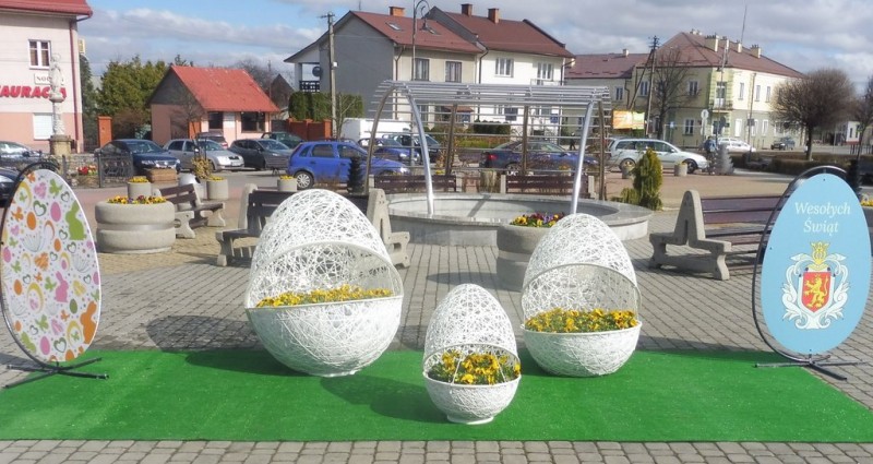 Tuż przy fonntanie stanęło pięć pisanek, które wprowadzają mieszkańców i przejeżdżajacych przez miasteczko w świąteczny nastrój.