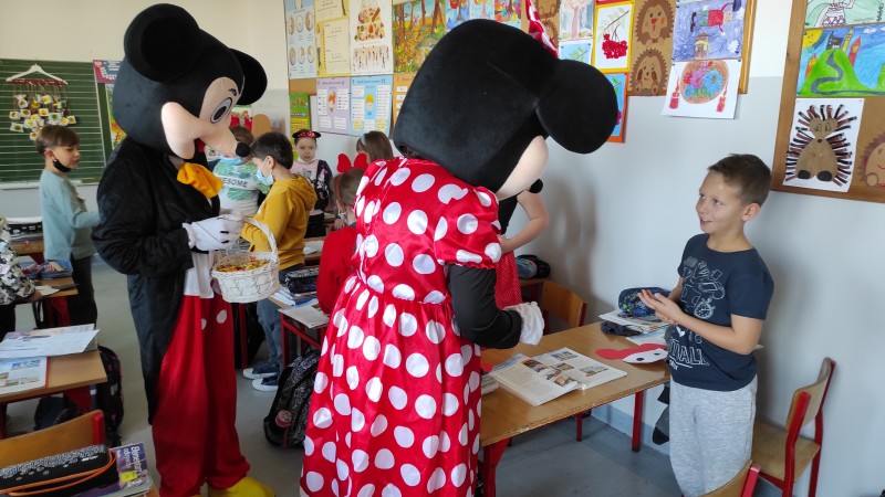 W ubiegłym roku również świętowaliśmy urodziny Myszki Miki, napisaliśmy listy do Myszki Miki i ku naszemu zaskoczeniu Myszka odpisała i wyraziła nadzieję na szybkie spotkanie. Toteż ogromną niespodzianką była wizyta Myszki Miki i Myszki Minnie w naszej szkole. Obie myszki odwiedziły naszych uczniów w klasach, którzy wręczyli jubilatowi piękne kartki z życzeniami wykonane na języku angielskim oraz zaśpiewały serdeczne happy birthday dla Myszki Miki. Nasi goście z Disneylandu porozmawiały z dziećmi w języku angielskim, a na koniec spotkania Myszka Miki odwdzięczyła się pysznymi słodyczami.