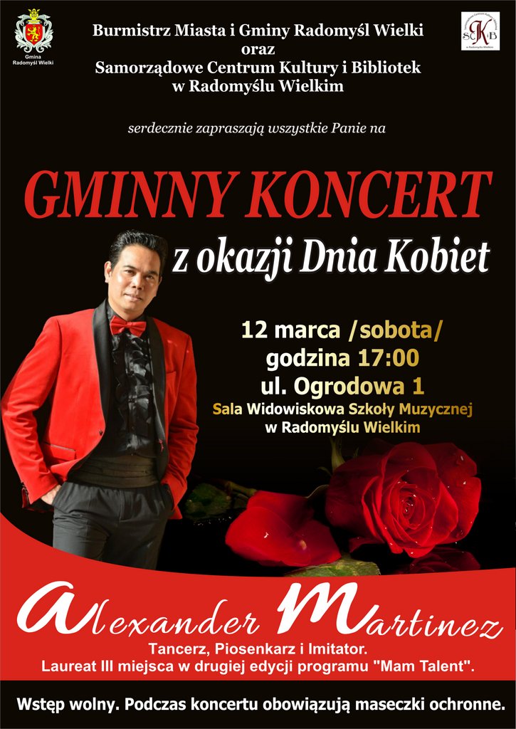 W sobotę (12 marca) z okazji Dnia Kobiet w sali widowiskowej Szkoły Muzycznej w Radomyślu Wielkim (przy ul. Ogrodowej 1) wystąpi Aleksander Martinez, piosenkarz i tancerz, zdobywca 3. miejsca w drugiej edycji programu Mam Talent.