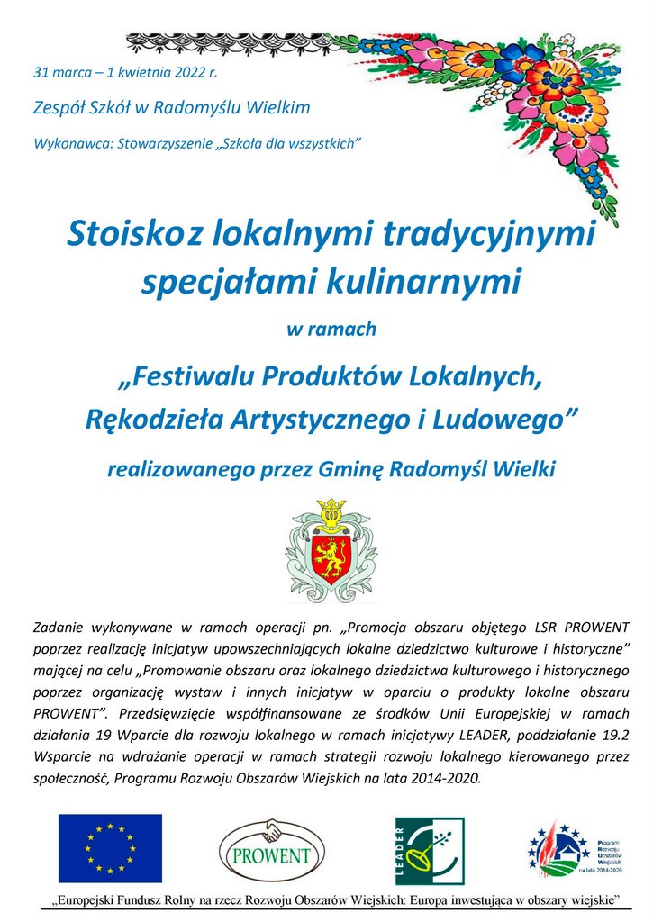 Wykonanie stoiska z kulinariami wpisało się w projekt grantowy pt. „Promocja obszaru objętego LSR PROWENT poprzez realizację inicjatyw upowszechniających lokalne dziedzictwo kulturowe i historyczne” realizowanego przez LGD PROWENT z poddziałania „Wsparcie na wdrażanie operacji w ramach strategii rozwoju lokalnego kierowanego przez społeczność” objętego PROW na lata 2014-20”.