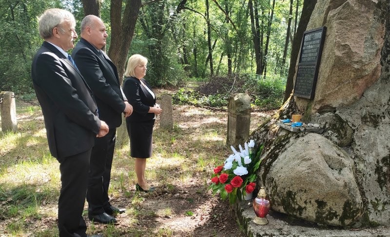 Z-ca burmistrza Jarosław Godek, sekretarz Maria Należna i dyrektor GZEAS Andrzej Przybyszewski złożyli kwiaty i zapalili znicze przy pomniku martyrologii, odmówili też modlitwę za zmarłych. W uroczystości uczestniczyła także dr Maria Przybyszewska, która odczytała fragmenty wspomnień kobiet ocalałych z zagłady, w tym z naszych okolic, które zostały spisane w książce pt.: „Szczęście posiadać Dom pod ziemią….”. Złożyła też symboliczne kamyki przy macewach oraz przypomniała o tym, że cmentarz żydowski w Radomyślu jest dowodem obecności ludności żydowskiej na terenie gminy, a pamięć o tych wydarzeniach i tym miejscu powinna być w szczególności przekazywana młodemu pokoleniu.