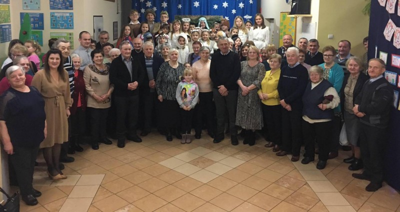 Wszyscy uczniowie brali udział w przedstawieniu jasełkowym. Z ogromnym zaangażowaniem przedstawili historię Marii i Józefa, piękne kolędy były miłym dodatkiem do sen jasełkowych. Dużo radości wniósł występ najmłodszych z oddziału przedszkolnego, którzy radosnym śpiewem i tańcem urozmaicili przedstawienie. Na finał wnuczęta zaśpiewały życzenia, które wywołały łzę wzruszenia, potem każde dziecko wręczyło Dziadkowi i Babci laurkę i czerwone serce - wyraz ich miłości .