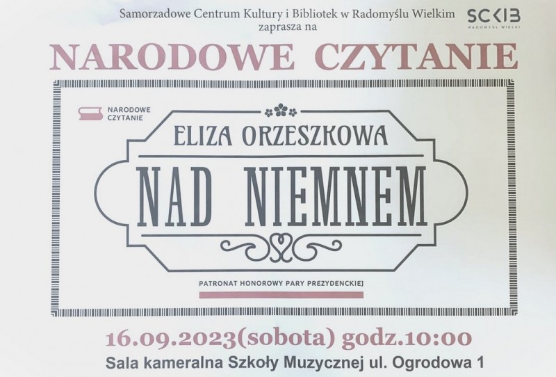 Zaplanowane z tej okazji spotkanie odbędzie się w najbliższą sobotę, 16 września, o godzinie 10:00 w sali kameralnej Szkoły Muzycznej (ul.Ogrodowa 1). Podczas spotkania odczytane zostaną fragmenty powieści „Nad Niemnem” Elizy Orzeszkowej.