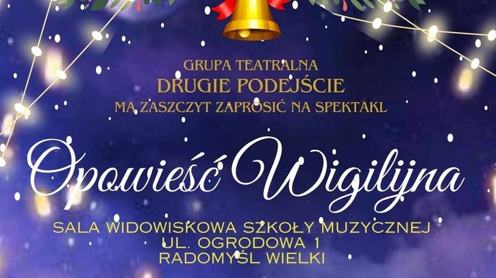 Zapraszamy na spektakl "Opowieść Wigilijna" w wykonaniu Grupy Teatralnej Drugie Podejście, który odbędzie się w najbliższą sobotę, 13 stycznia, w sali widowiskowej przy ul. Ogrodowej 1 w Radomyślu Wielkim.