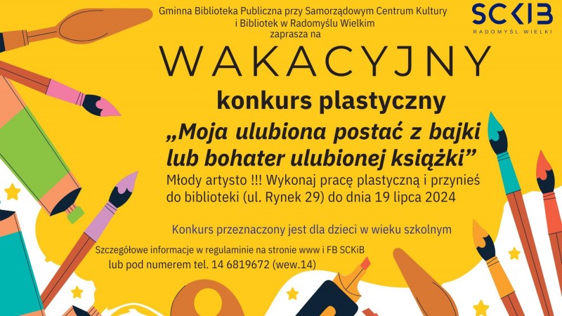 Prace należy dostarczyć do 19 lipca do Biblioteki Publicznej w Radomyślu Wielkim, ul. Rynek 29. Każda praca powinna być podpisana (imię, nazwisko, wiek dziecka, kategoria, miejscowość, nr telefonu).