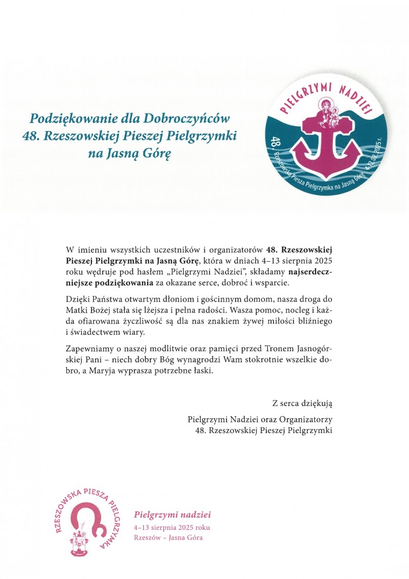 Podziękowania dla Dobroczyńców 48. Rzeszowskiej Pieszej Pielgrzymki na Jasną Górę