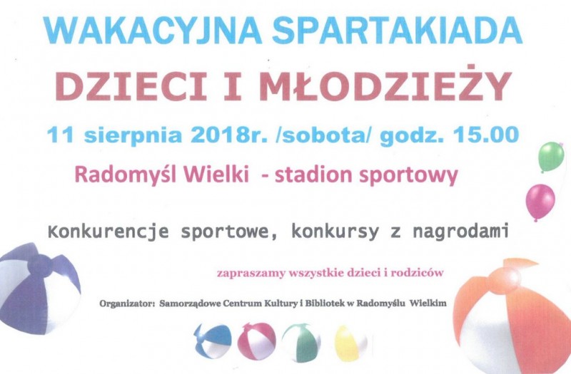 Impreza rozpocznie się o godz. 15.00 na stadionie sportowym w Radomyślu Wielkim. W ramach wakacyjnej spartakiady dzieci będą rywalizowały o nagrody w różnych konkurencjach sprawnościowych. Organizatorem jest Samorządowe Centrum Kultury i Bibliotek w Radomyślu Wielkim.