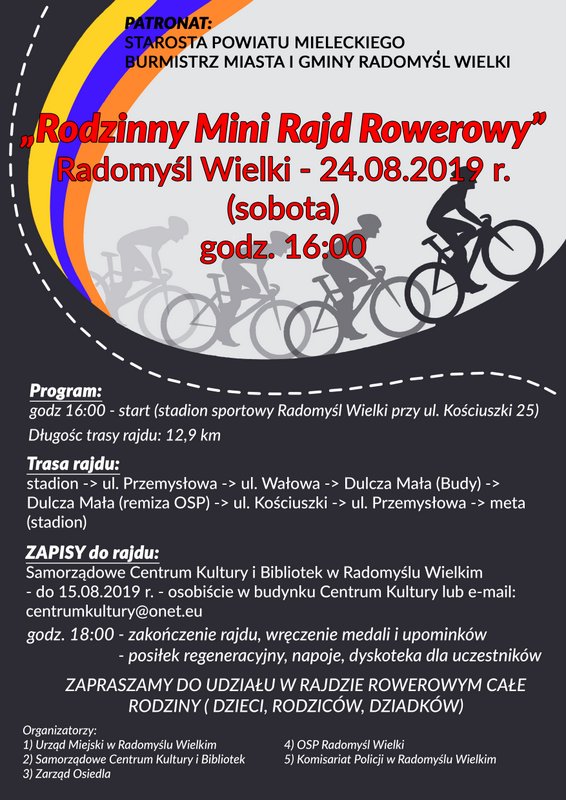 W tym roku trasa rajdu biegła będzie ze stadionu w Radomyślu Wielkim ul. Przemysłową, Wałową do Dulczy Małej - Budy - remiza OSP, ul. Kościuszki z powrotem na stadion. W sumie do przejechania będzie ok. 13 km. Start nastąpi o godz. 16:00, a koniec ok. 17:15. Organizatorzy zapewniają dla każdego, zgłoszonego do rajdu uczestnika pamiątkowy medal, posiłek regeneracyjny i napoje chłodzące. Na zakończenie przewidziana jest dyskoteka. Zgłoszenia do rajdu należy składać osobiście w SCKiB w Radomyślu Wielkim (ul. Rynek 29) lub przesłać na adres e-mail: centrumkultury@onet.eu do 15 sierpnia br.
