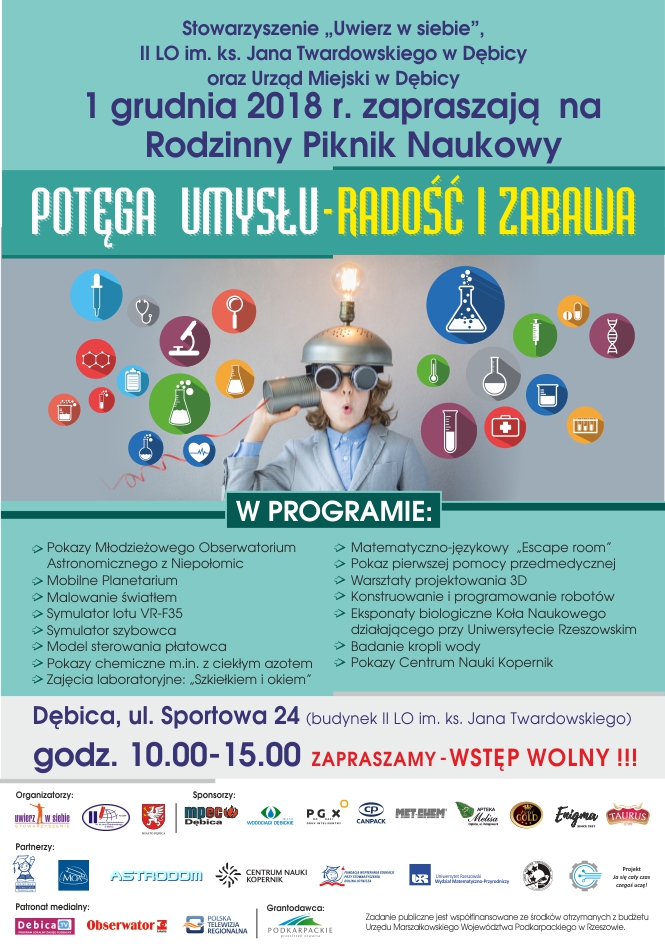 Każdy, kto chce poznać pasjonujący świat nauki i eksperymentów, powinien 1 grudnia 2018 r. (sobota) wybrać się na Rodzinny Piknik Naukowy „POTĘGA UMYSŁU – RADOŚĆ I ZABAWA”. W budynku II LO im. ks. Jana Twardowskiego w Dębicy przy ul. Sportowej 24 od godz. 10.00 do 15.00 będzie można zobaczyć ponad 20 fantastycznych pokazów i prezentacji przybliżających zagadnienia naukowe