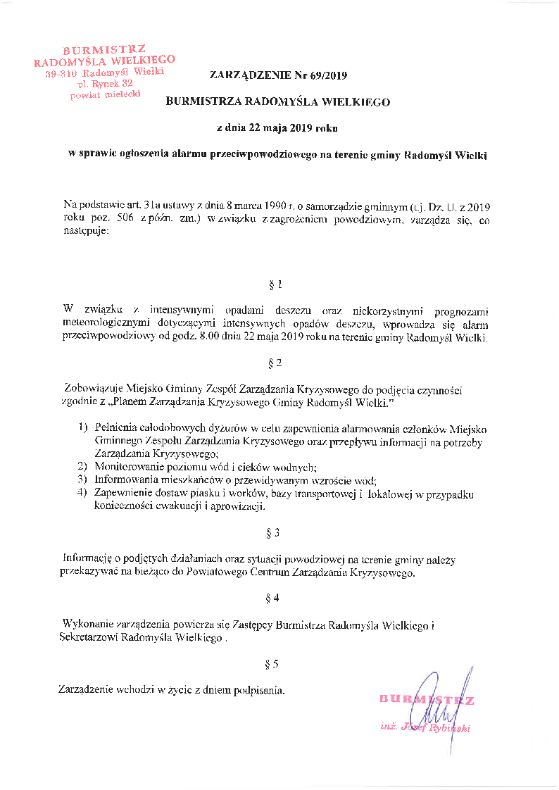 Zarządzenie nr 69/2019 Burmistrza Radomyśla Wielkiego z dnia 22 maja 2019 roku