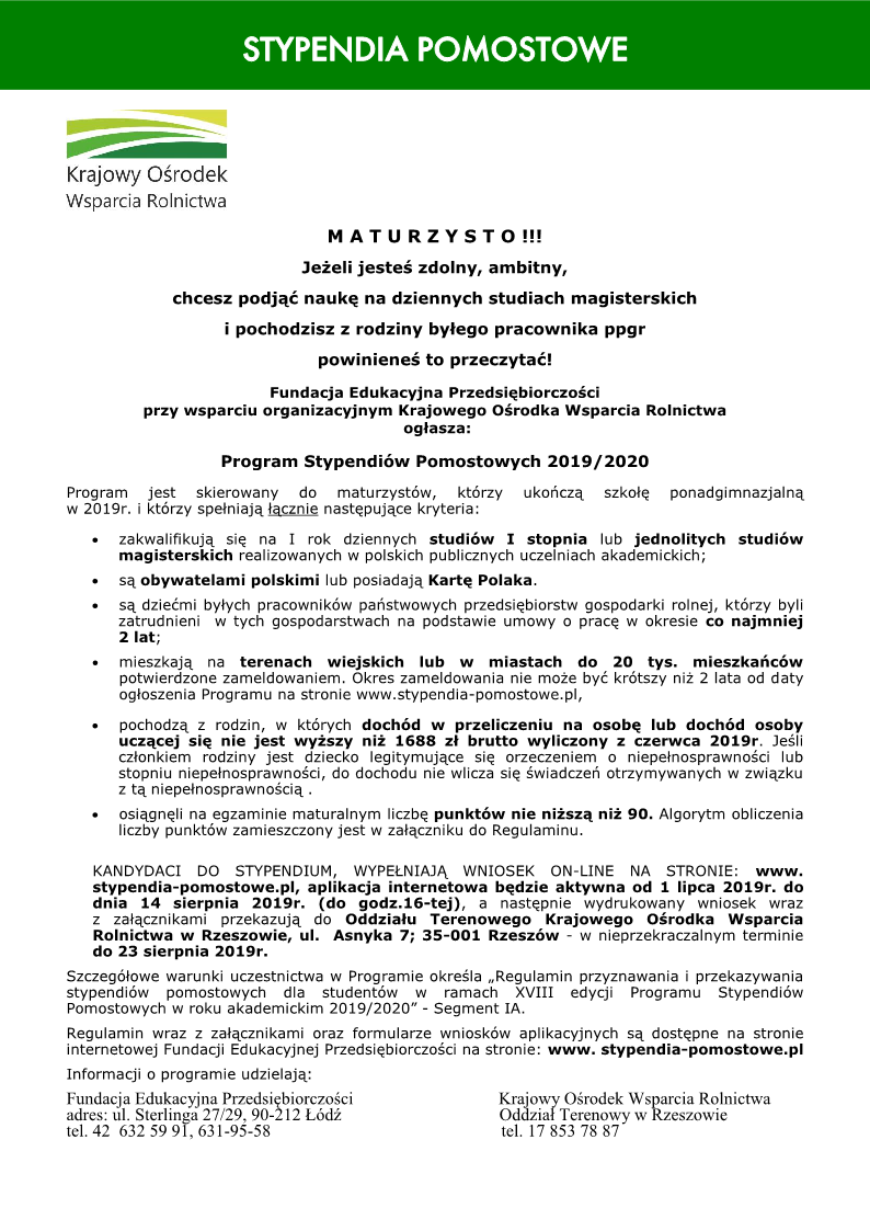 M A T U R Z Y S T O !!! Jeżeli jesteś zdolny, ambitny, chcesz podjąć naukę na dziennych studiach magisterskich i pochodzisz z rodziny byłego pracownika ppgr powinieneś to przeczytać!
