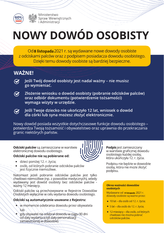 Od 8 listopada 2021 r. są wydawane nowe dowody osobiste z odciskami palców oraz z podpisem posiadacza dowodu osobistego. Dzięki temu dowody osobiste są bardziej bezpieczne