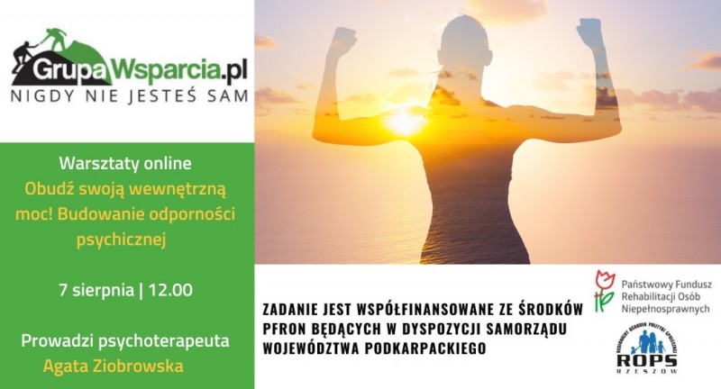 „Obudź swoją wewnętrzną moc! – budowanie odporności psychicznej” – to tytuł warsztatu online, który odbędzie się już w najbliższą sobotę, 7 sierpnia, o godz. 12.00 na platformie GrupaWsparcia.pl. To pierwszy warsztat z cyklu dziesięciu, które odbędą się w ramach programu bezpłatnej pomocy psychologiczno-prawnej dla osób niepełnosprawnych z województwa podkarpackiego. Warsztat poprowadzi doświadczona psychoterapeutka Agata Ziobrowska. Zadanie jest współfinansowane ze środków PFRON będących w dyspozycji samorządu województwa podkarpackiego.