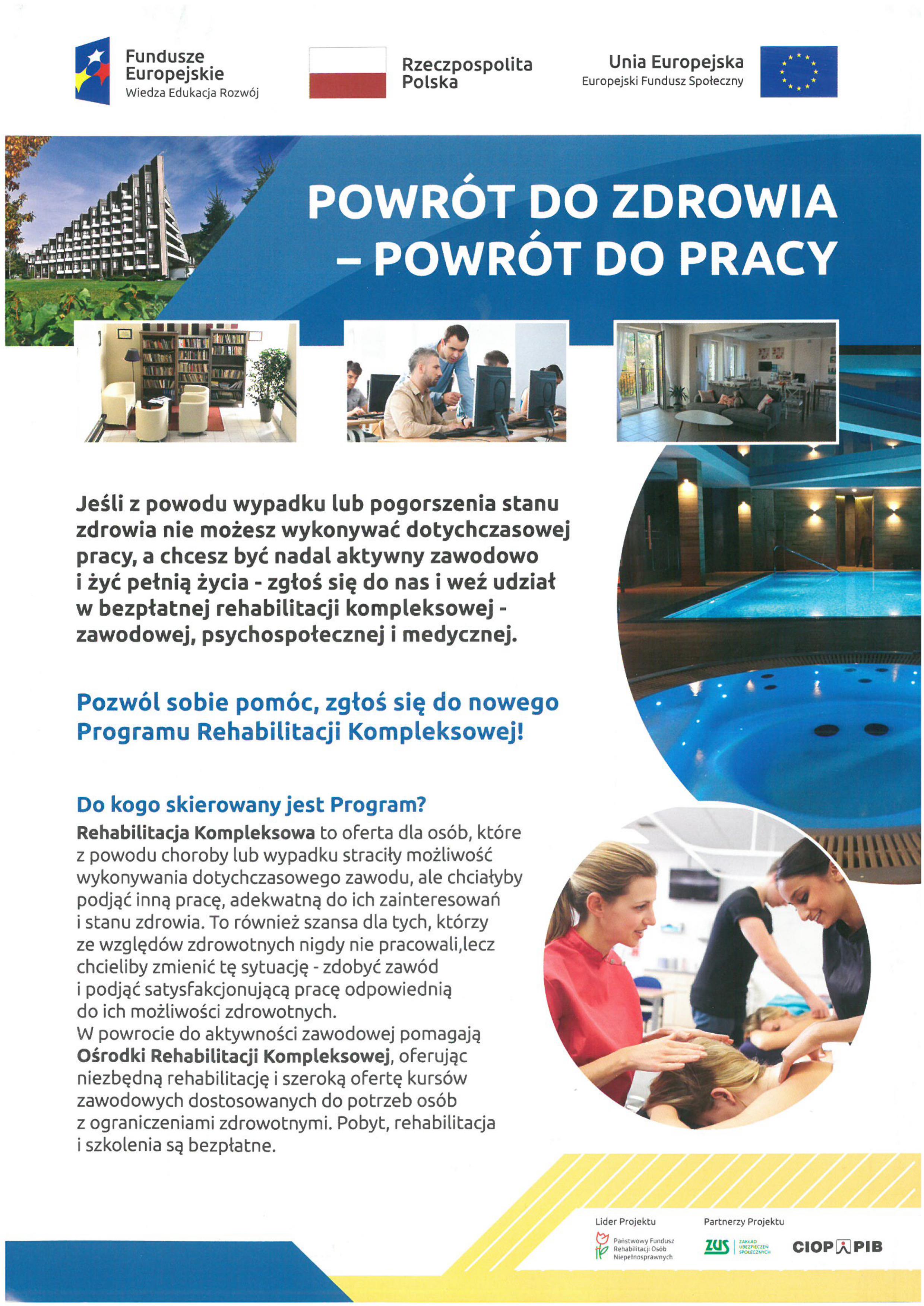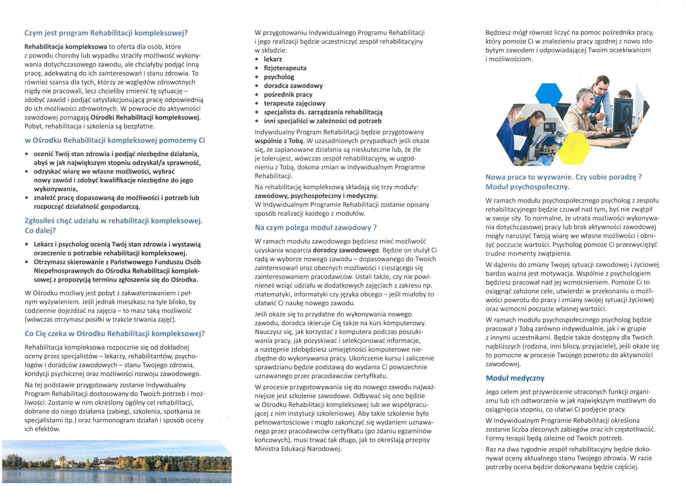 Program rehabilitacji kompleksowej proponuje szereg rozwiązań (pod okiem lekarza, psychologa, doradcy zawodowego, fizjoterapeuty) mających na celu ułatwienie podjęcia pracy lub powrotu do zatrudnienia. Adresowany jest do osób, które wskutek doznanego urazu, zdiagnozowanego schorzenia, niepełnosprawności wrodzonej lub nabytej w okresie rozwojowym, nie mogą kontynuować aktywności zawodowej.