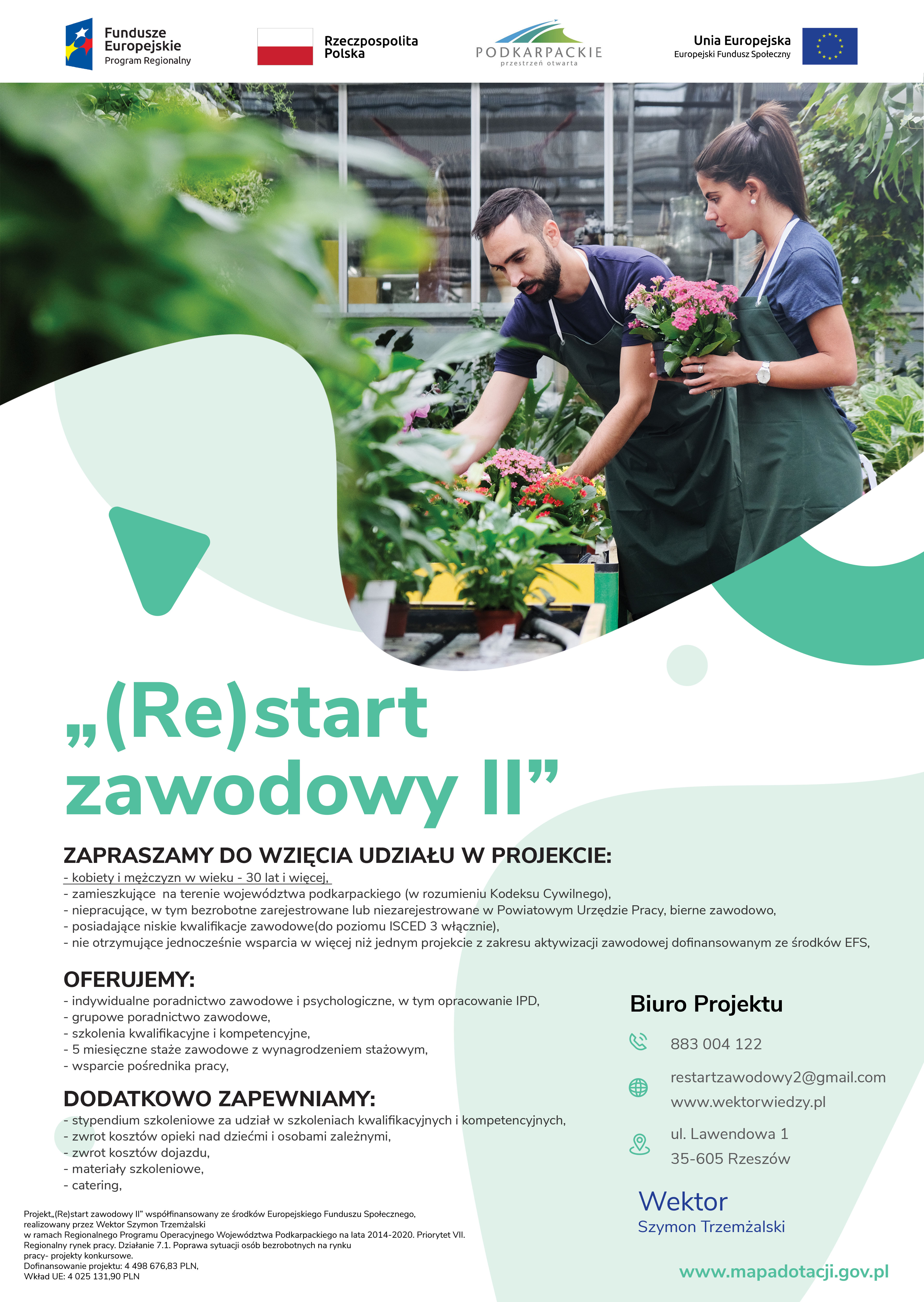 W związku z rozpoczęciem realizacji projektu pn. „(Re)start zawodowy II”, współfinansowanego ze środków Europejskiego Funduszu Społecznego, w ramach Programu Operacyjnego Regionalny Program Operacyjny Województwa Podkarpackiego na lata 2014-2020 Priorytet VII. Regionalny rynek pracy Działanie 7.1. Poprawa sytuacji osób bezrobotnych na rynku pracy- projekty konkursowe, przesyłamy Państwu informację o możliwości skorzystania ze wsparcia dla osób bezrobotnych.