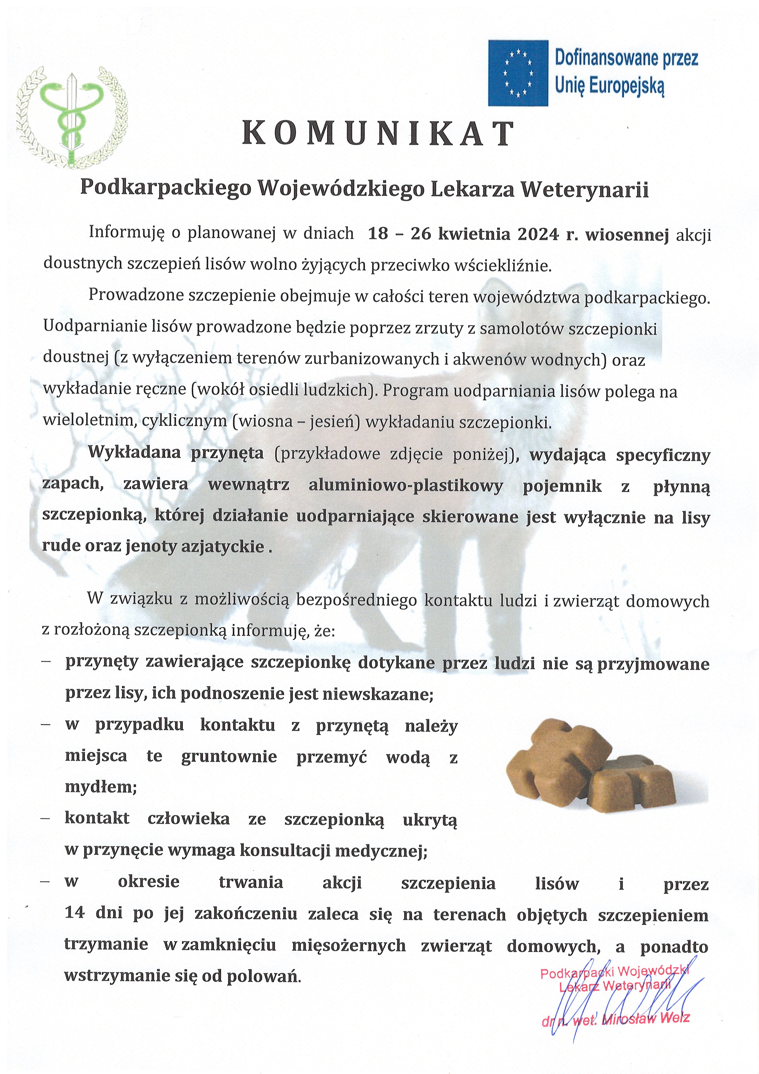 w dniach 18 - 26 kwietnia planowania jest wiosenna akcja szczepienia lisów wolno żyjących przeciwko wściekliźnie. Uodparnianie lisów, podobnie jak w latach poprzednich, przebiegać będzie w formie samolotowych zrzutów szczepionki doustnej.