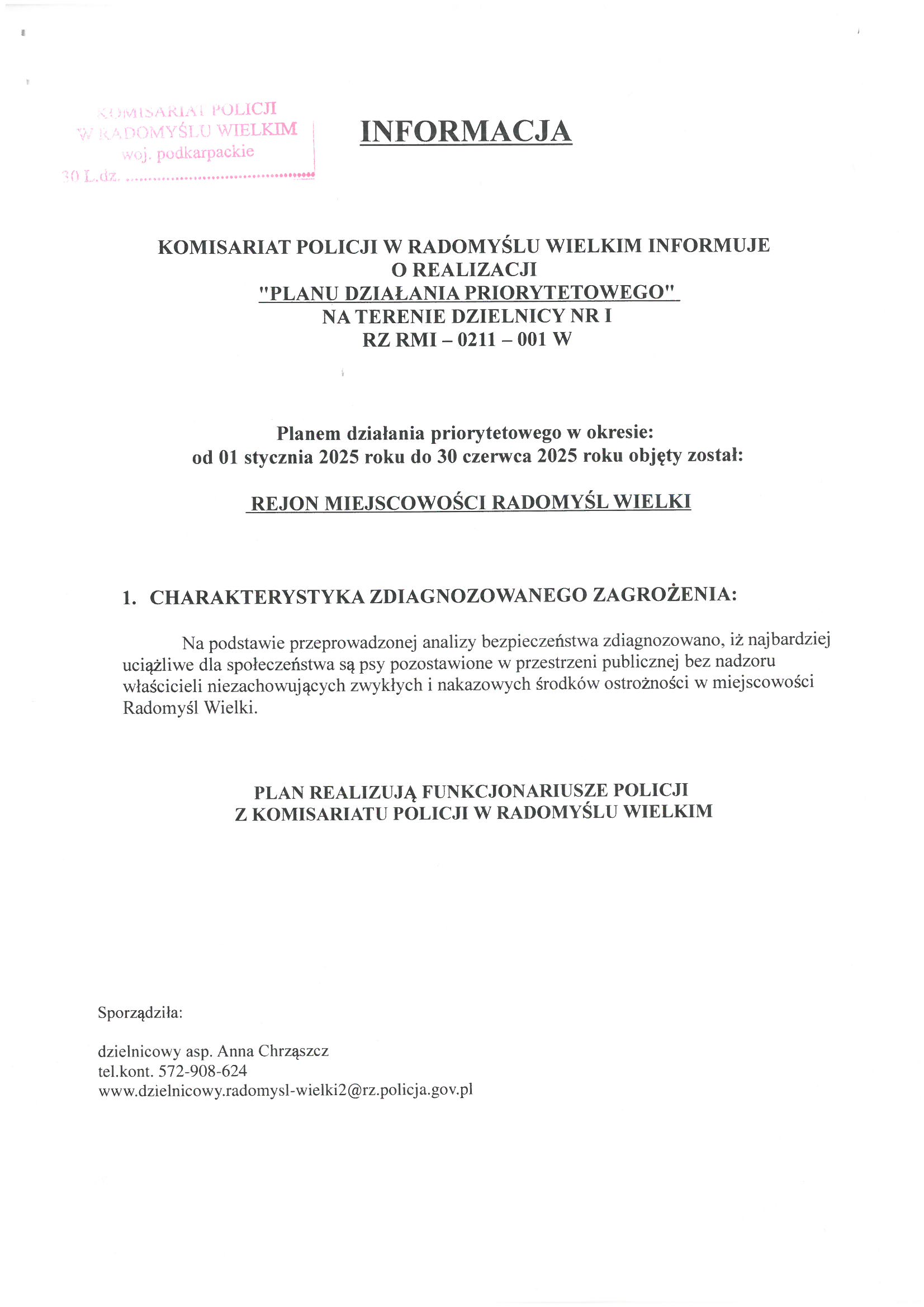 Komisariat Policji w Radomyślu Wielkim informuje o realizacji Planu Działania Priorytetowego na terenie dzielnicy nr I - rejon miejscowości Radomyśl Wielki.