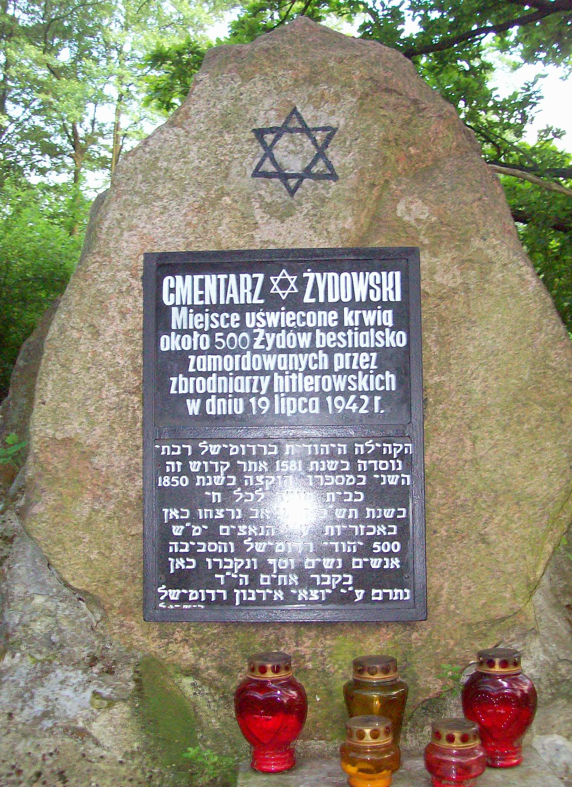 Pomnik powstał z inicjatywy prezesa Towarzystwa Przyjaciół Ziemi Radomyskiej Jana Ziobronia. Na cmentarzu żydowskim, którym od 2013 r. zarządza Gmina Żydowska w Krakowie, zachowały się jeszcze macewy z XIX wieku. Jest to miejsce pamięci o historii Radomyśla Wielkiego.
