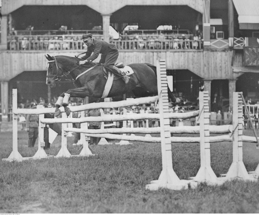 Krajowe zawody konne na hipodromie w Łazienkach Królewskich w Warszawie (maj 1932 r.). Kapitan Franciszek Mrowec na koniu Moskal w konkursie zwycięzców im. Naczelnego Redaktora i Wydawcy IKC posła na Sejm Mariana Dąbrowskiego w trakcie skoku przez przeszkodę. Fot. NAC zbiory online