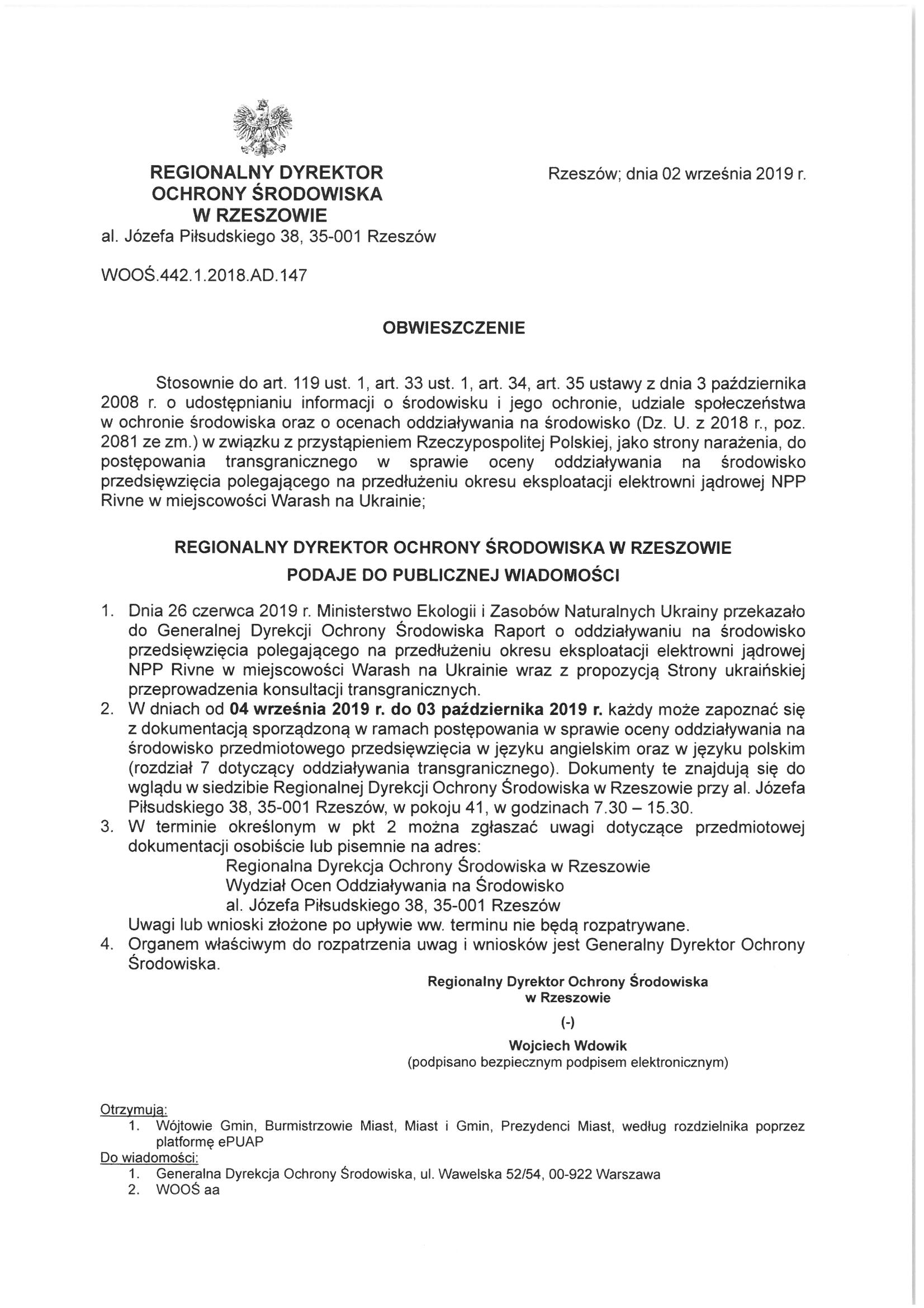 Obwieszczenie Regionalnego Dyrektora Ochrony Środowiska w Rzeszowie
