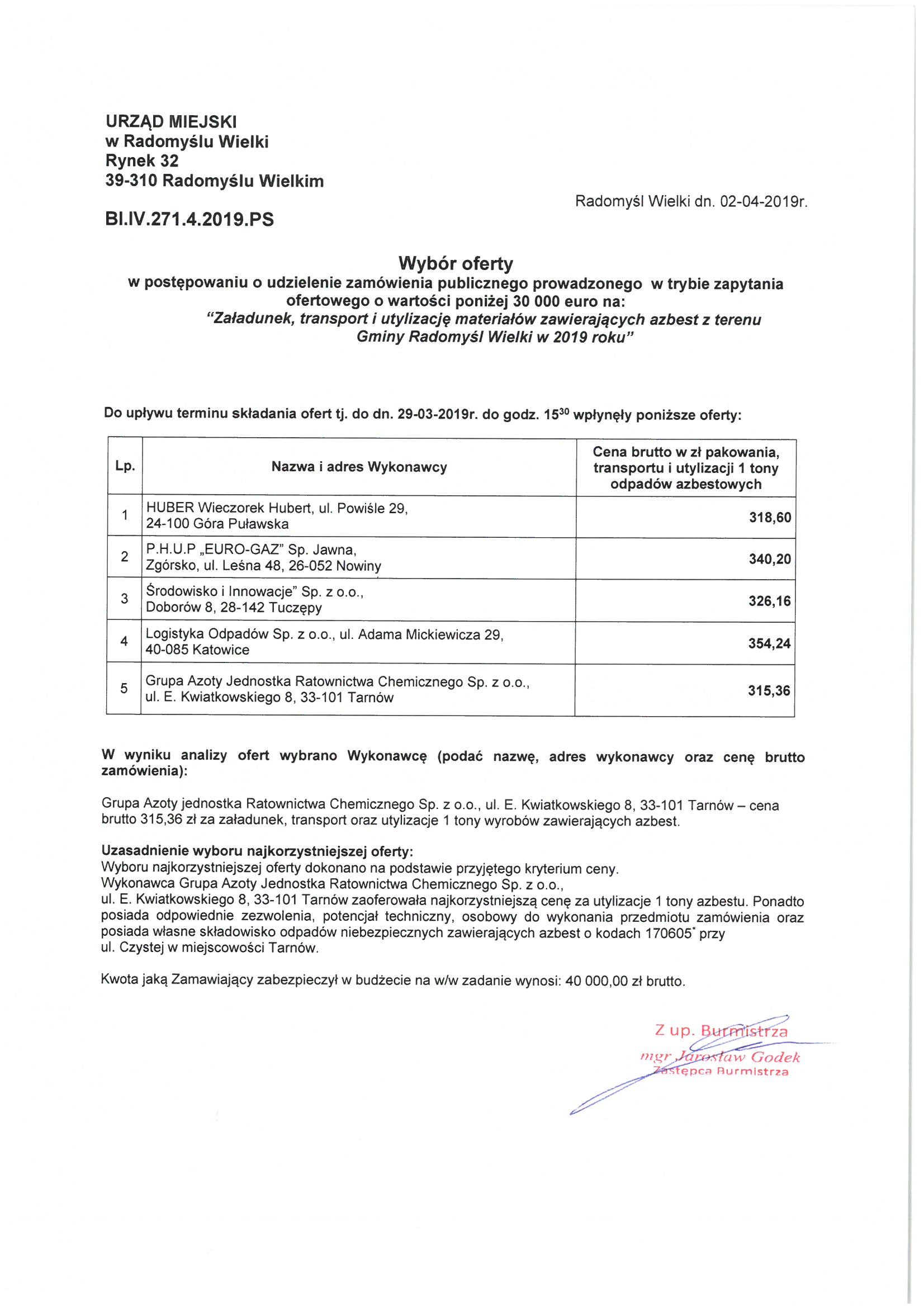 dotycząca wyboru oferty w postępowaniu o udzielenie zamówienia publicznego prowadzonego w trybie zapytania ofertowego o wartości poniżej 30 000 euro na: “Załadunek, transport i utylizację materiałów zawierających azbest z terenu Gminy Radomyśl Wielki w 2019 roku”